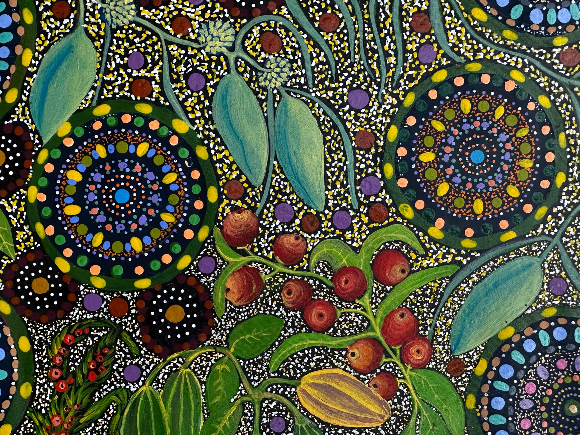 Silvia’s artwork reflects her country and the stories around ceremony and bush foods.