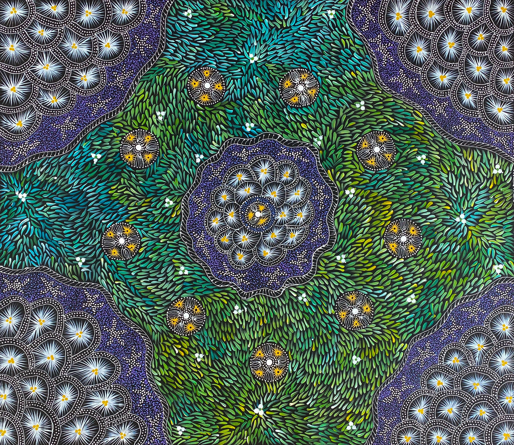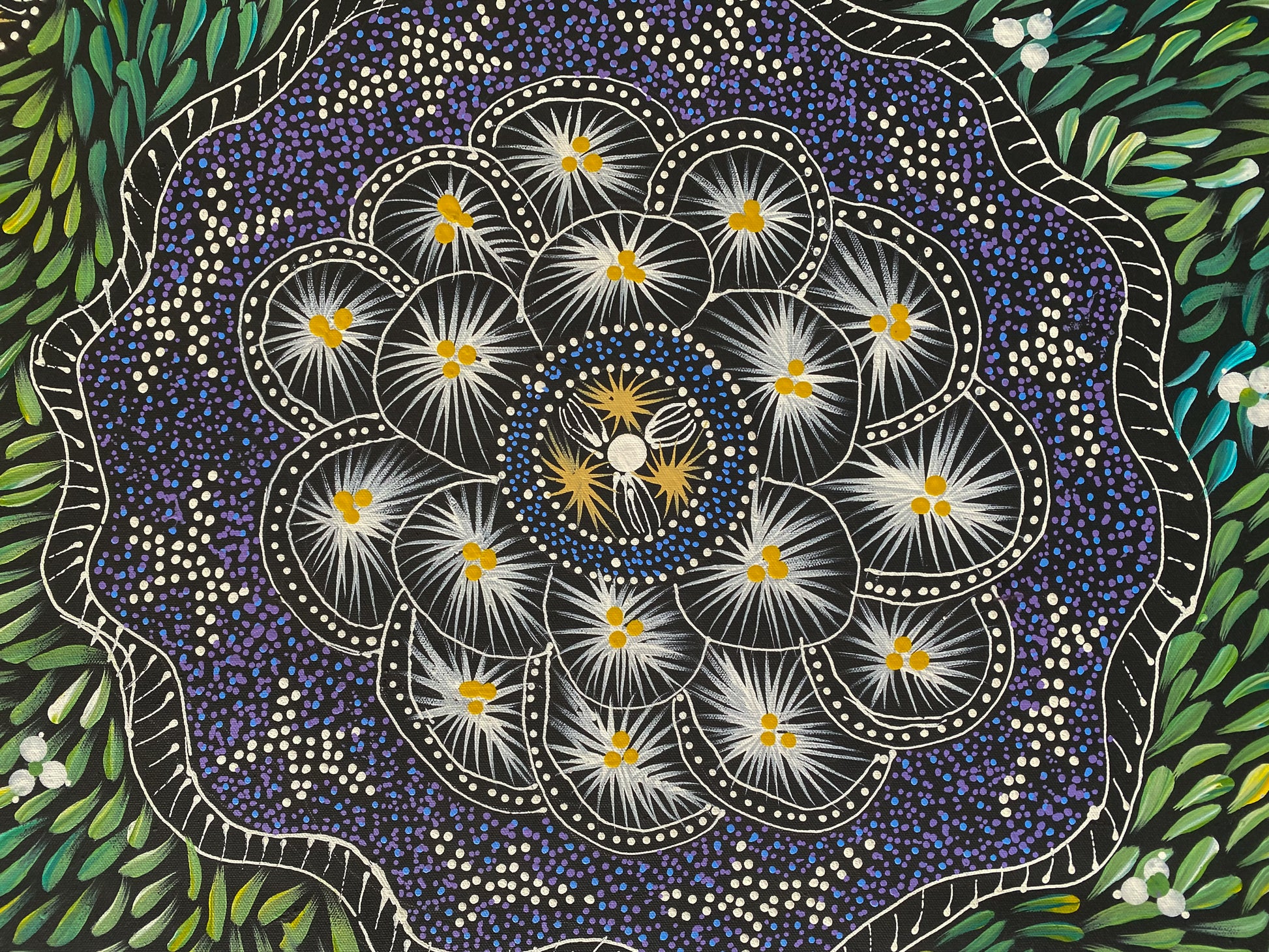 Teresa paints the stories around the various bush foods collected by the women and bush medicine. She also paints her Country (Atneltyeye) and uses traditional dot style technique to produce an aerial view of her ancestral land.