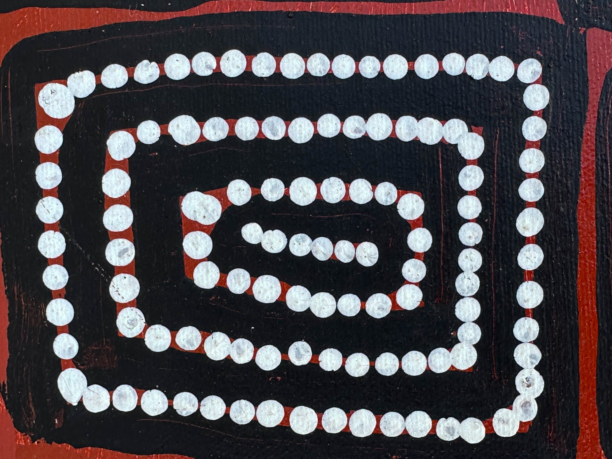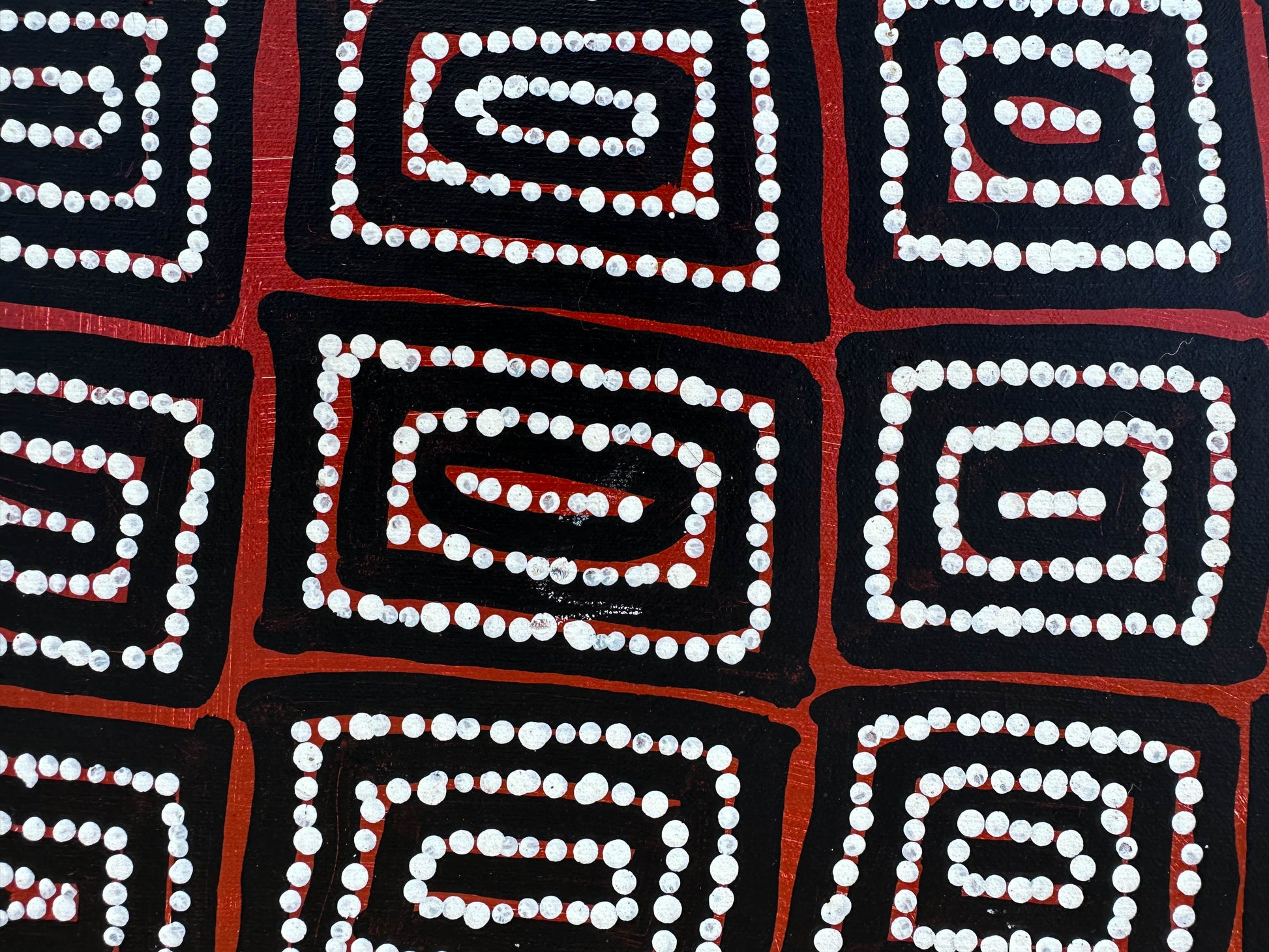 Several years after emerging from the desert Thomas, Warlimpirrnga, Walala, Yukultji and Yalti started painting. Thomas paints Tingari Stories using traditional dot style to create simplistic geometric designs which is a technique shared with other Pintupi artists such as George Ward Jungurrayi. Aboriginal artists often create paintings that consist of multiple layers of meanings. Often those meanings are not shared with outsiders (the uninitiated). The Tingari Cycle from what we understand is a series of sacred and mythological ceremonies describing the journeys of their ancestors in Tjkurrpa (dreamtime).