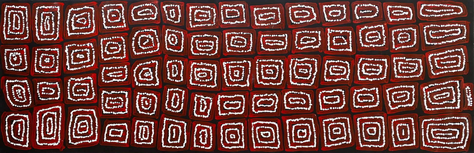 Several years after emerging from the desert Thomas, Warlimpirrnga, Walala, Yukultji and Yalti started painting. Thomas paints Tingari Stories using traditional dot style to create simplistic geometric designs which is a technique shared with other Pintupi artists such as George Ward Jungurrayi. Aboriginal artists often create paintings that consist of multiple layers of meanings. Often those meanings are not shared with outsiders (the uninitiated). The Tingari Cycle from what we understand is a series of sacred and mythological ceremonies describing the journeys of their ancestors in Tjkurrpa (dreamtime).